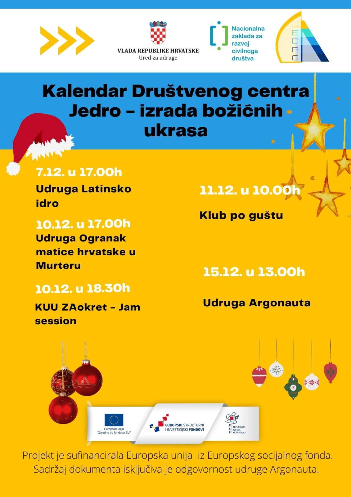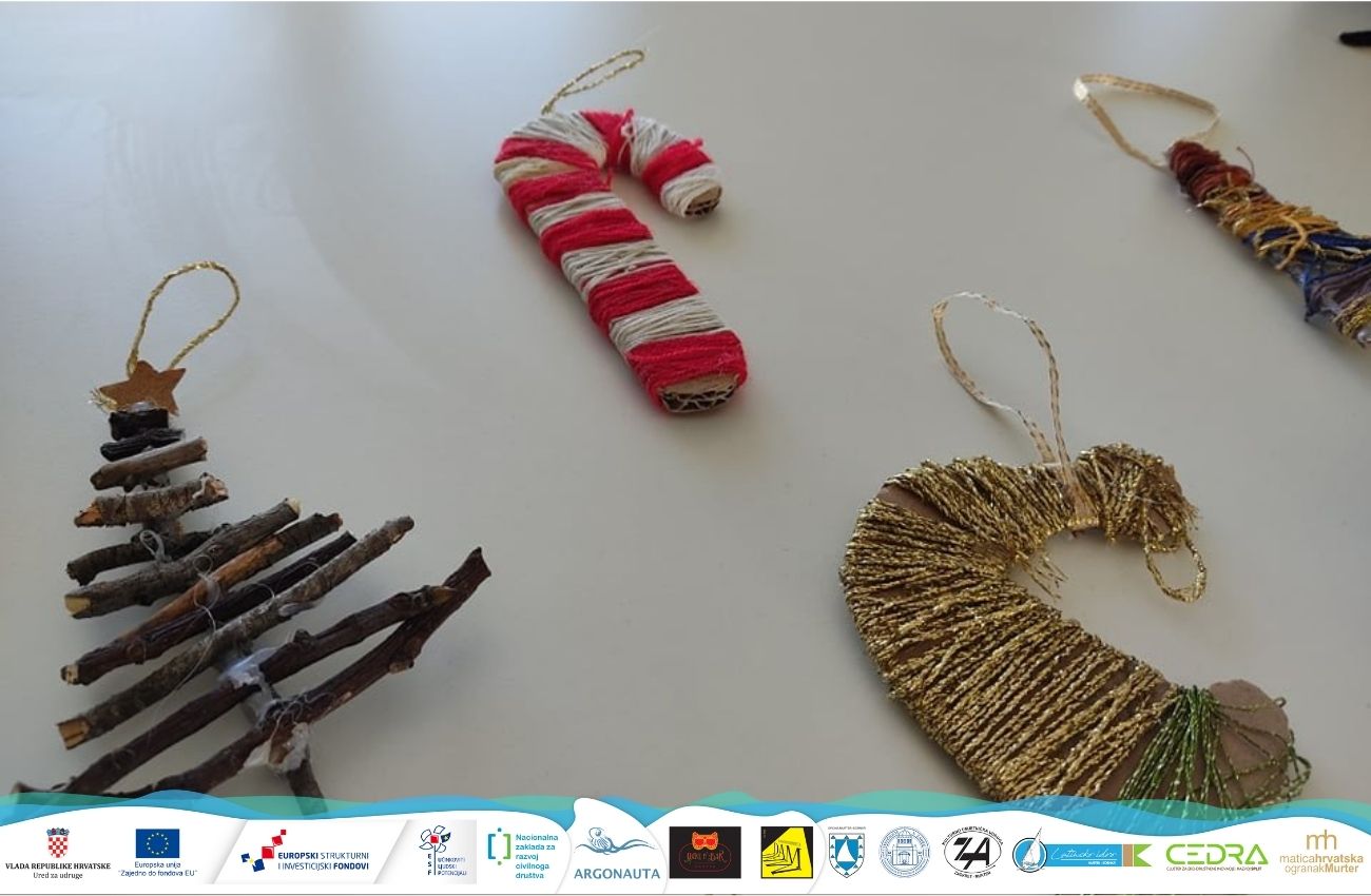 Prosinac će u Društvenom centru Jedro biti pun kreativnog druženja koje će organizirati lokalne murterske udruge Latinsko idro, Ogranak Matice hrvatske u Murteru i naše udruge Argonauta. Tako će se svi zainteresirani u Murteru moći pridružiti jednoj od udruga i zajedno s njima izrađivati božićne ukrase od recikliranih materijala. Ove godine će se aktivnostima udruga pridružiti i mlade snage murterske lokalne zajednice pod nazivom Klub po guštu.