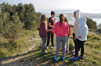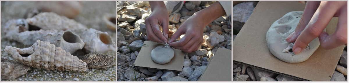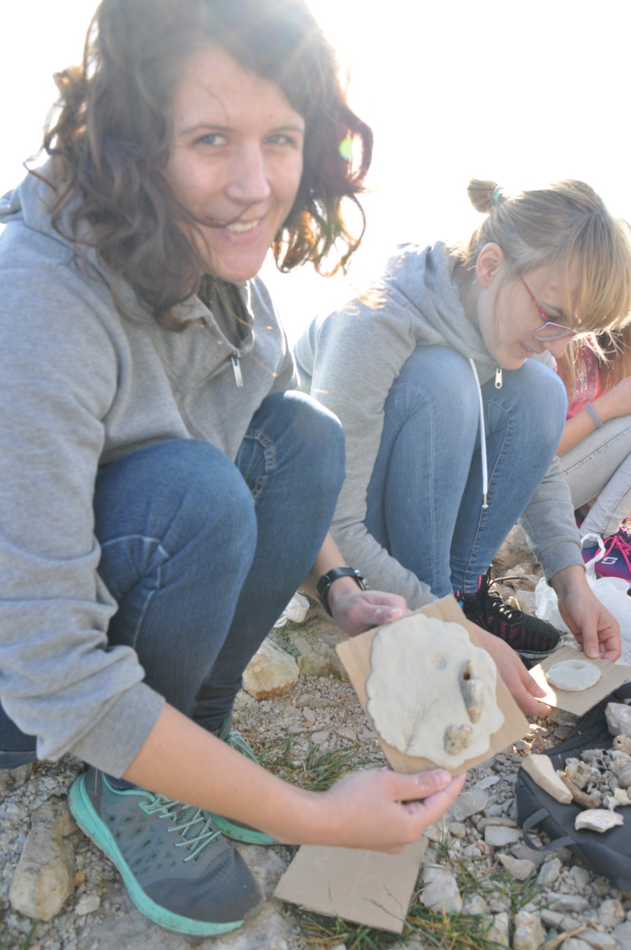 Nakon što smo zagrebali u teoriju prešli smo u akciju! Članovi i voditelji Eko-patrole raštrkali su se Gradinom sa zadatkom da pronađemo svoje fosile, okamenjene školjke ili zanimljive stijene. Nakon sat vremena potrage u ugodnoj šetnji našli smo se ponovo svi skupa na vrhu, da pokažemo jedni drugima što smo pronašli i popričamo o tome. Uistinu smo pronašli jedan pravi fosil rudista! Ostalo su bile školje, zanimljive formacije u vapnencu i nekoliko vrsti drugog kamenja. Sa skupljenim kamenjem napravili smo “test tvrdoće” čiji je cilj bio primjetiti kako su stijene i kamenje u prirodi različite tvrdoće, što nam dokazuje njihov različit postanak. Nakon toga napravili smo sami svoje fosile – fosile budućnosti – utiskivajući pronađene školjkice i listiće biljaka u glinamol.