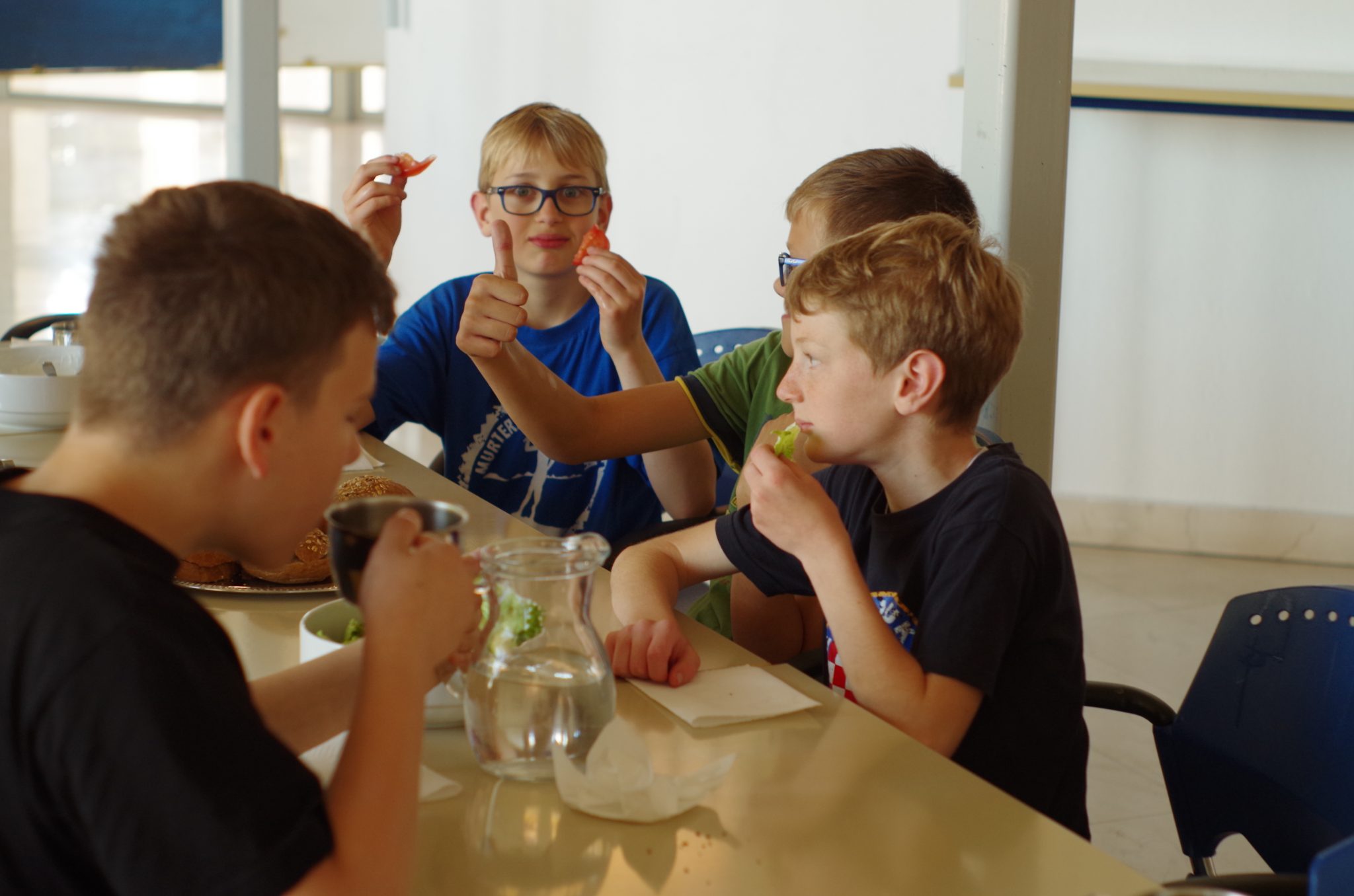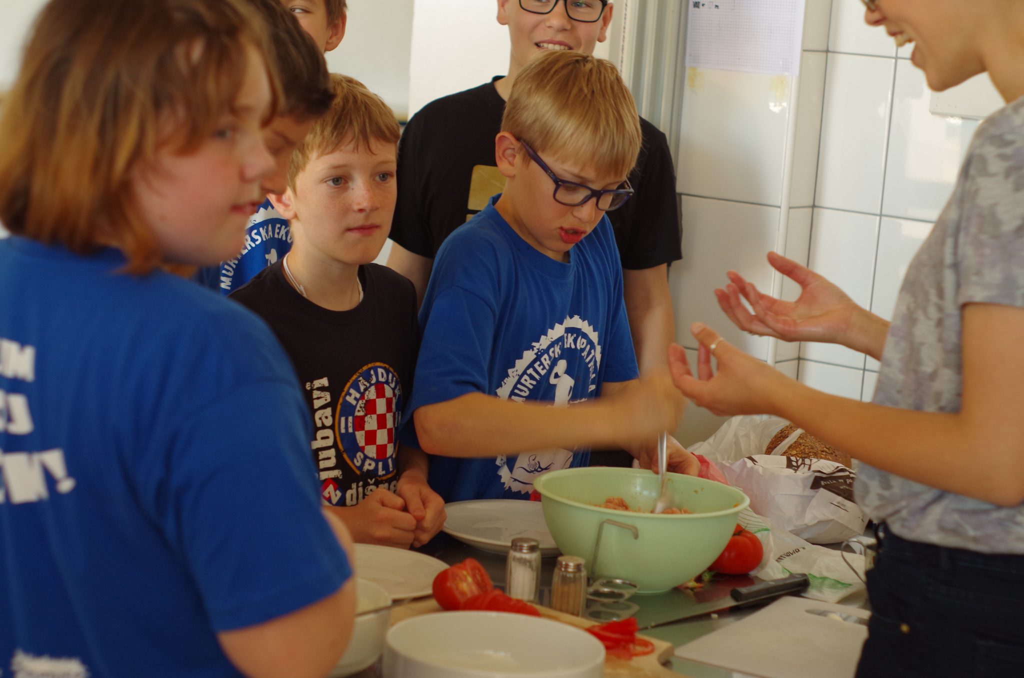 Patrolaši su ovu subotu 13.05.2017. započeli igrama da se malo rasterete od obaveza koje donosi kraj školske godine, a potom su opet bili spremni za naučiti nešto novo. Složili su piramidu zdrave prehrane, naučili za što je koji “kat” piramide dobar te u kojoj količini bi trebali jesti određene namirnice. Ispostavilo se da su jako dobri u teoretskom znanju iz PET ZDRAVIH NAVIKA što uključuje: PUNO VODE, VOĆE I POVRĆE, OBAVEZAN DORUČAK, SPORT I DOBAR SAN, ali da u praksi malo “štekaju”. Kako bi to ispravili odmah smo se dali u pripremu svježeg smoothiea te pravljenje zdravih burgera. Zadovoljstvo i oduševljenje djece dok su prali salatu, sjeckali rajčice, pravili polpete je teško prenijeti. Upravo zbog toga, ovim putem svi mi apeliramo da se vrati domaćinstvo u naš obrazovni sustav jer KUHATI NAM SE SVIDJELO! 🙂
