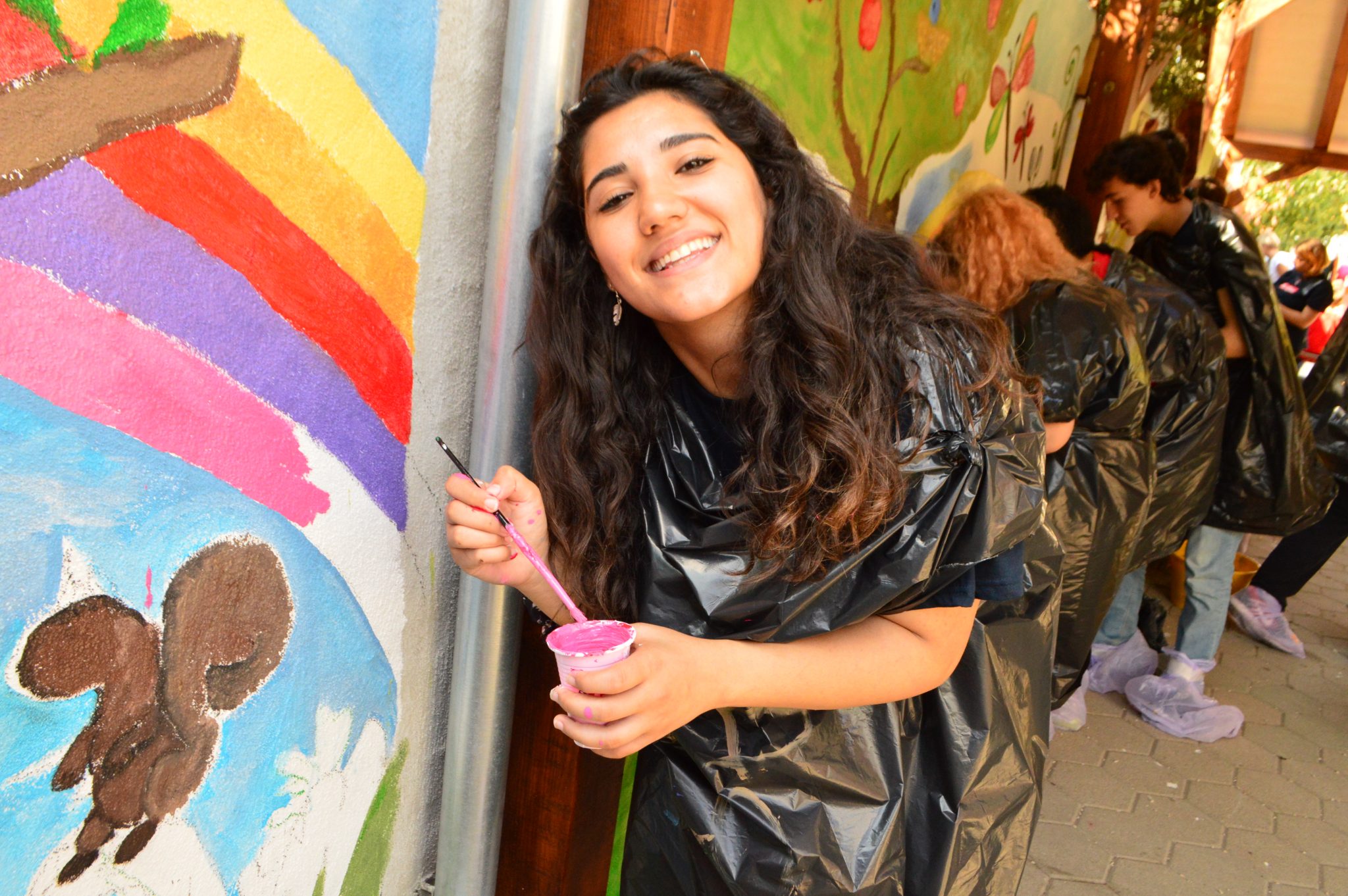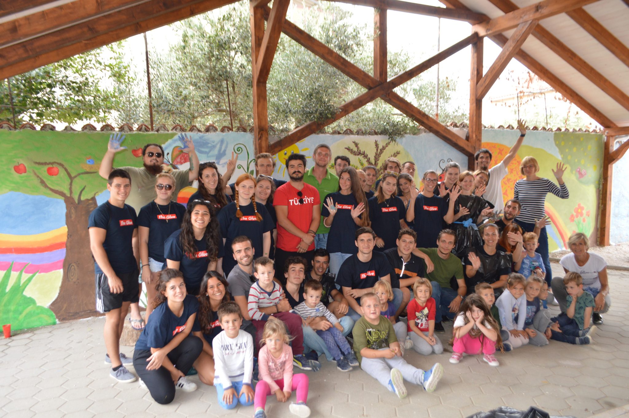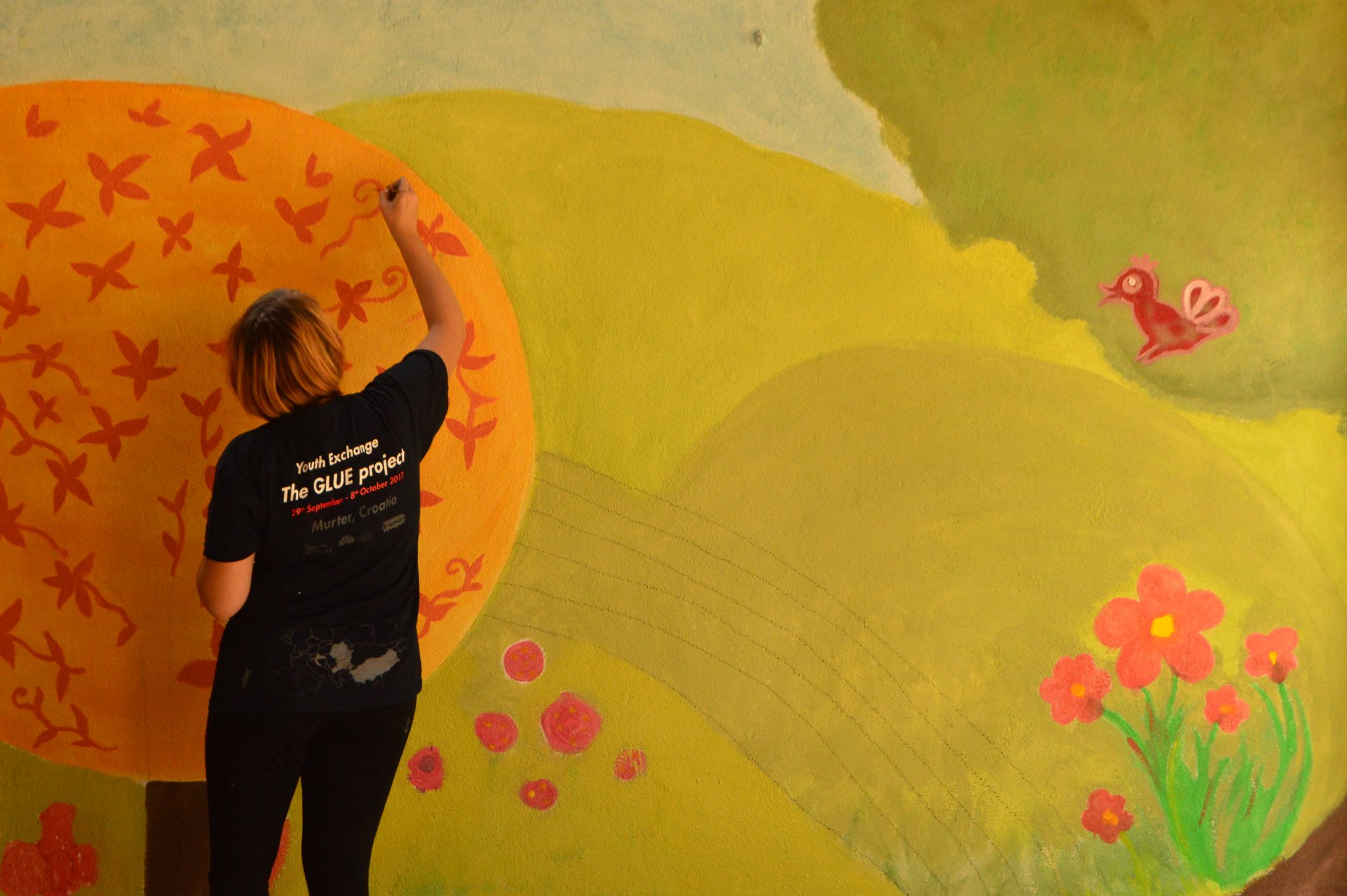Ovaj kreativni volonterski zadatak jako se svidio našim sudionicima. Iako je u akciji sudjelovalo 40 volontera na zidu dužem od 10 metara bilo je mjesta da svako pokloni dio svoje kreativnisti najmlađima. Kako je zid gredama podjeljen u 4 jednake plohe tako su se i naši volonteri podijelili u 4 tima te su naslikali stabla masline i jabuke s livadom, cvijećem, pčelicama, pticama, bumamarama, leptirima i još mnogim bićima dragima djeci. Većer prije zid su volonteri pripremili obojavši ga bijelom podlogom.