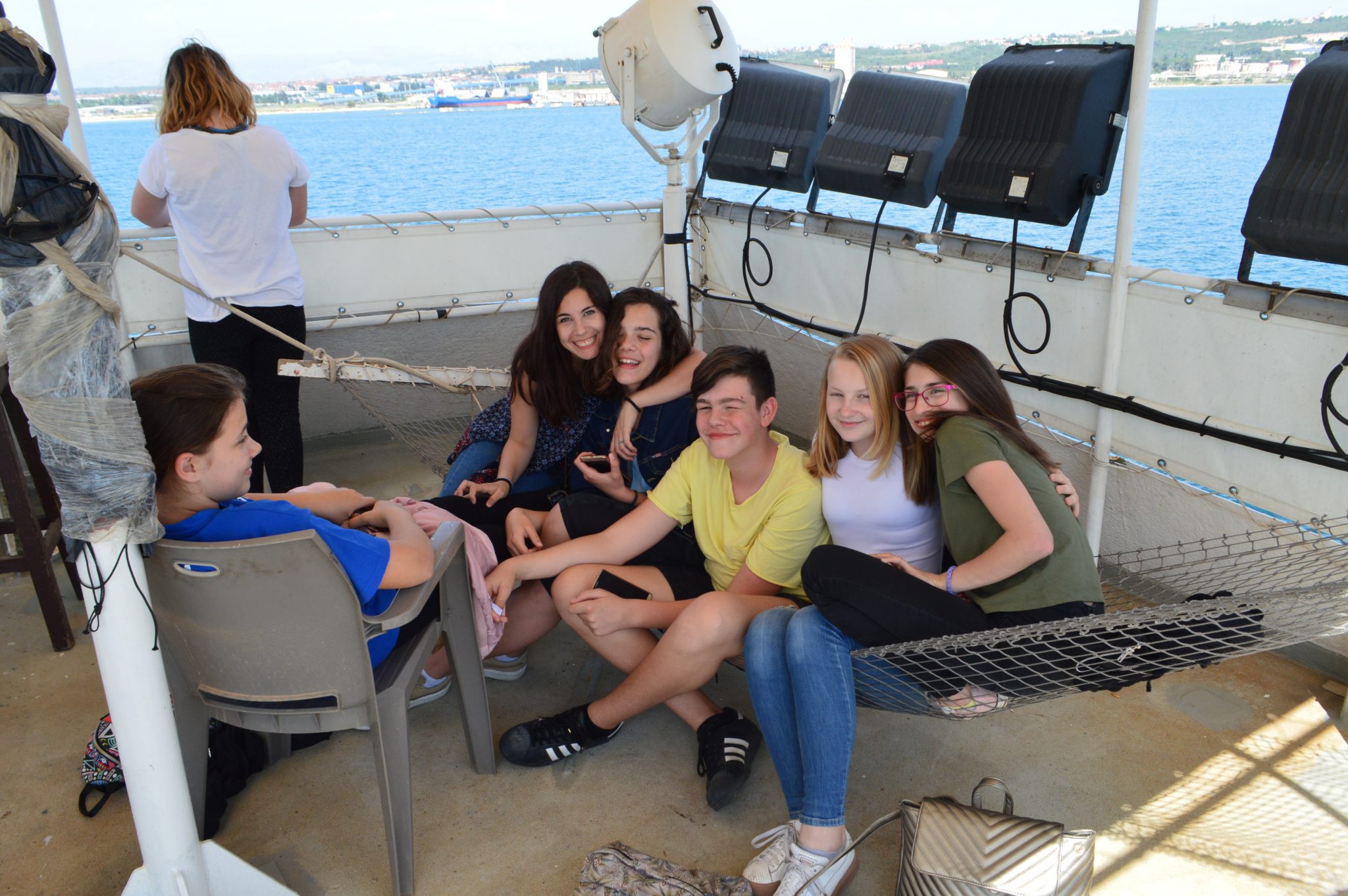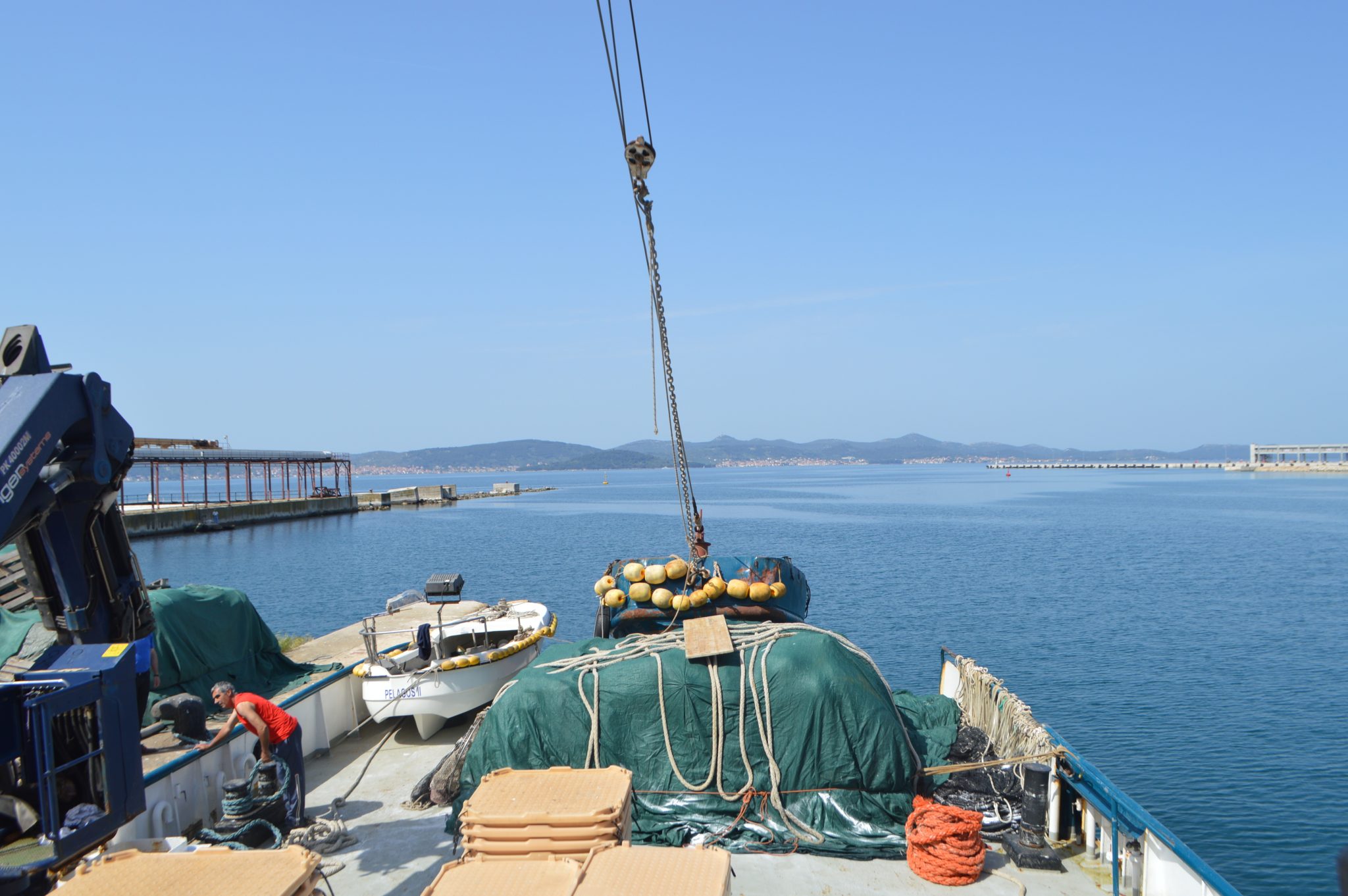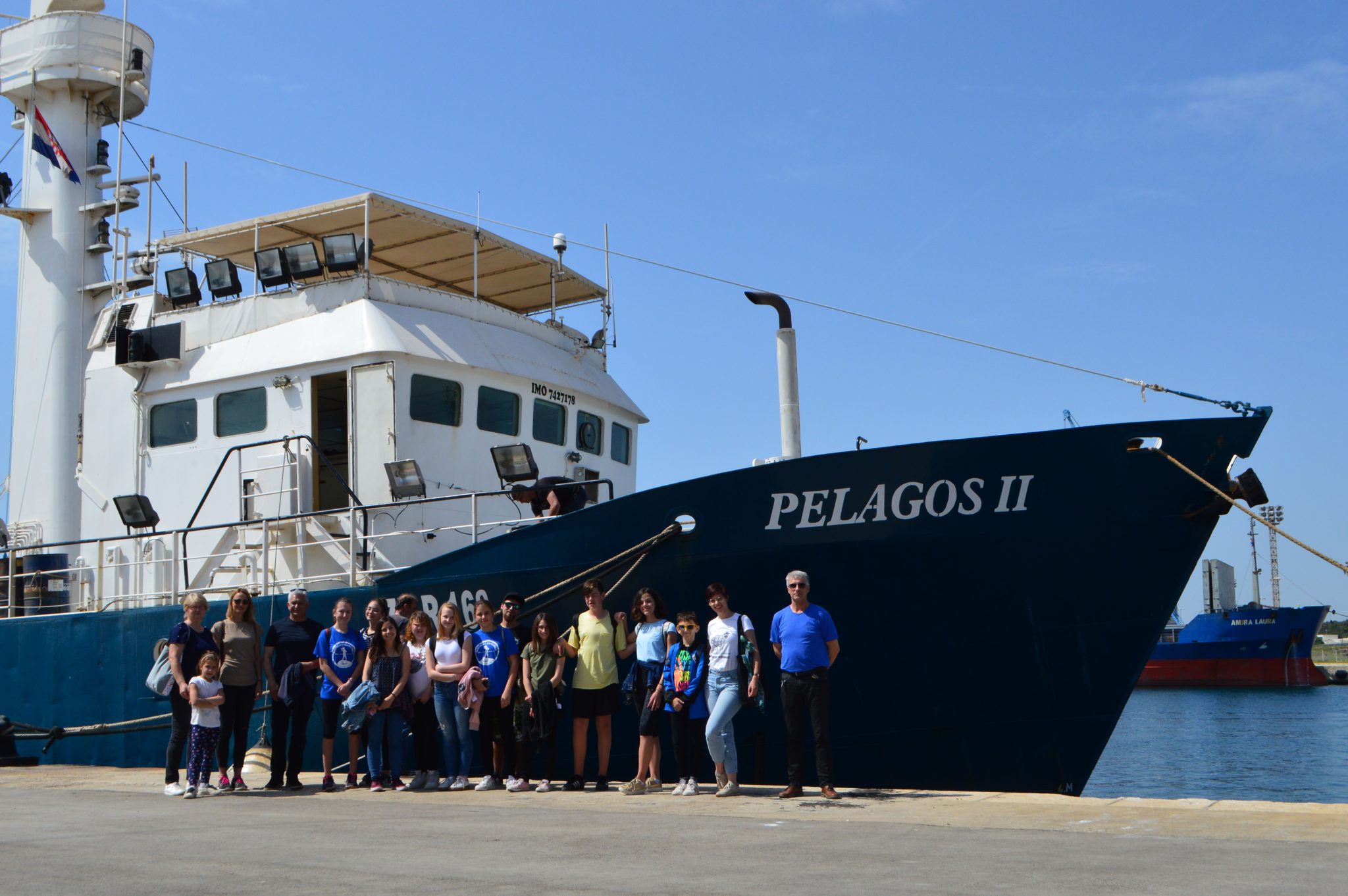 Nakon kopnenog dijela, ukrcali smo se na Pelagos II i spremno zaplovili prema otočiću Balabri, gdje se tunogojilište smjestilo. Djeca su bila oduševljena i Sirijskim brodom koji je u luci dopremio ogromne količine soli, potrebne za proizvodnju slanih inćuna, a odmah smo ispitali odakle se dovozi, zašto se uvozi, kako se sterilizira itd. Čini se da naše solane ipak nemaju toliki kapacitet da bi mogle proizvoditi dovoljno za sve, pa eto – možda to “miriše” na slobodna nišu i nova radna mjesta. Svakako, na putu prema tunogojilištu od direktora tvrtke, Nenada Horvata, saznali smo sve o načinu lovljenja tune u južnom dijelu Jadrana, načinima transporta, situacijama koje mogu poći po zlu, ICCAT-u i regulativama koje moraju biti zadovoljene, hranjenju tunu, čišćenju kaveza, reakcijama u slučaju nesreće itd. U kratkom druženju, gospodin Nenad nam je pokušao sumirati cijeli znanstveni, prehrambeni i poslovni aspekt uzgoja tune na čemu smo mu iznimno zahvalni!