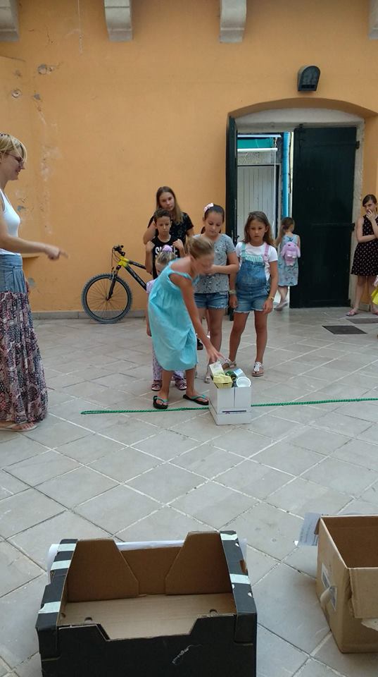 Udruga Argonauta održala je u četvrtak 12.07.2018., prvu ljetnu radionicu u gostima i to na temu Recycle & Reuse. Radionica je održana u Atriju palače Katunarić u Tisnom, od 20 do 21 sat, a u suradnji s Općinom Tisno, Narodnom knjižnicom i čitaonicom Tisno. Radionice Recycle & Reuse će svake – srijede i četvrtka – stvarati nešto novo i inovativno od drugačije vrste otpada. Ovaj tjedan vrijeme je bilo za prenamjenu velikih kutija. Oduševljeni raspoloženjem uspjeha hrvatske reprezentacije na Svjetskom prvenstvu, i samu temu smo prilagodili ni više ni manje nego – NOGOMETU. Djeca iz Tisnog naučila su kako ponovno iskoristiti veliku kutiju i samostalno stvoriti STOLNI NOGOMET za igru. Držeći se sportske tematike, radionicu smo započeli s igrom “Trasketball” (košarka sa smećem). Djeca su naučila kako razvrstati smeće igrajući košarku s plastičnim i papirnim otpadom, a potom su u timovima stvorili stadion za vlastiti svjetski kup! Ovaj put Mandžukić ili Modrić nisu bili na terenu, ali su ih zato zamijenili morski psi i hobotnice. Nakon što su djeca napravili svoje igrače i publiku, uživala su u igri od kartonskog stadiona i štapova napravljenih od papira.