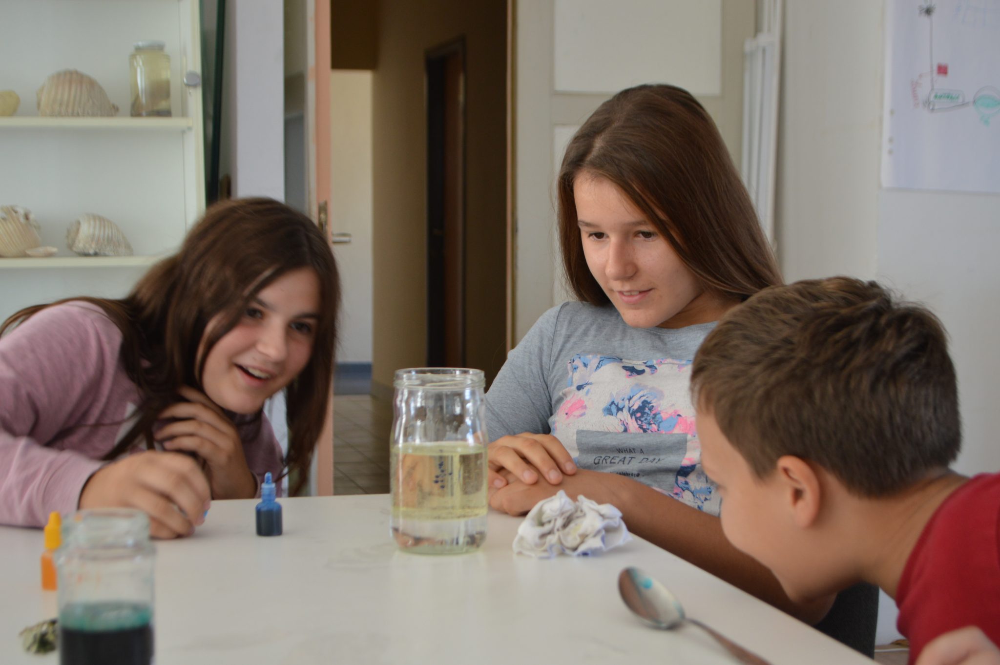 Kad smo se upoznali sa stablom masline i njenim štetnikom, naučili smo nešto i o karakteristikama maslinovog ulja, ali i ulja općenito. Naravno, najuspješniji načini za to su kemijski pokusi. U prvom eksperimentu ‘patrolaši’ su se upoznali s „neprijateljskim“ odnosom između ulja i vode, koji postaju prijatelji tek kad se između njih umiješa tekućina za pranje suđa (emulgator). Tada su shvatili na koji način djeluje sapun kod pranja ruku, kupka kod tuširanja i deterdžent kod pranja masnog suđa poslije jela.