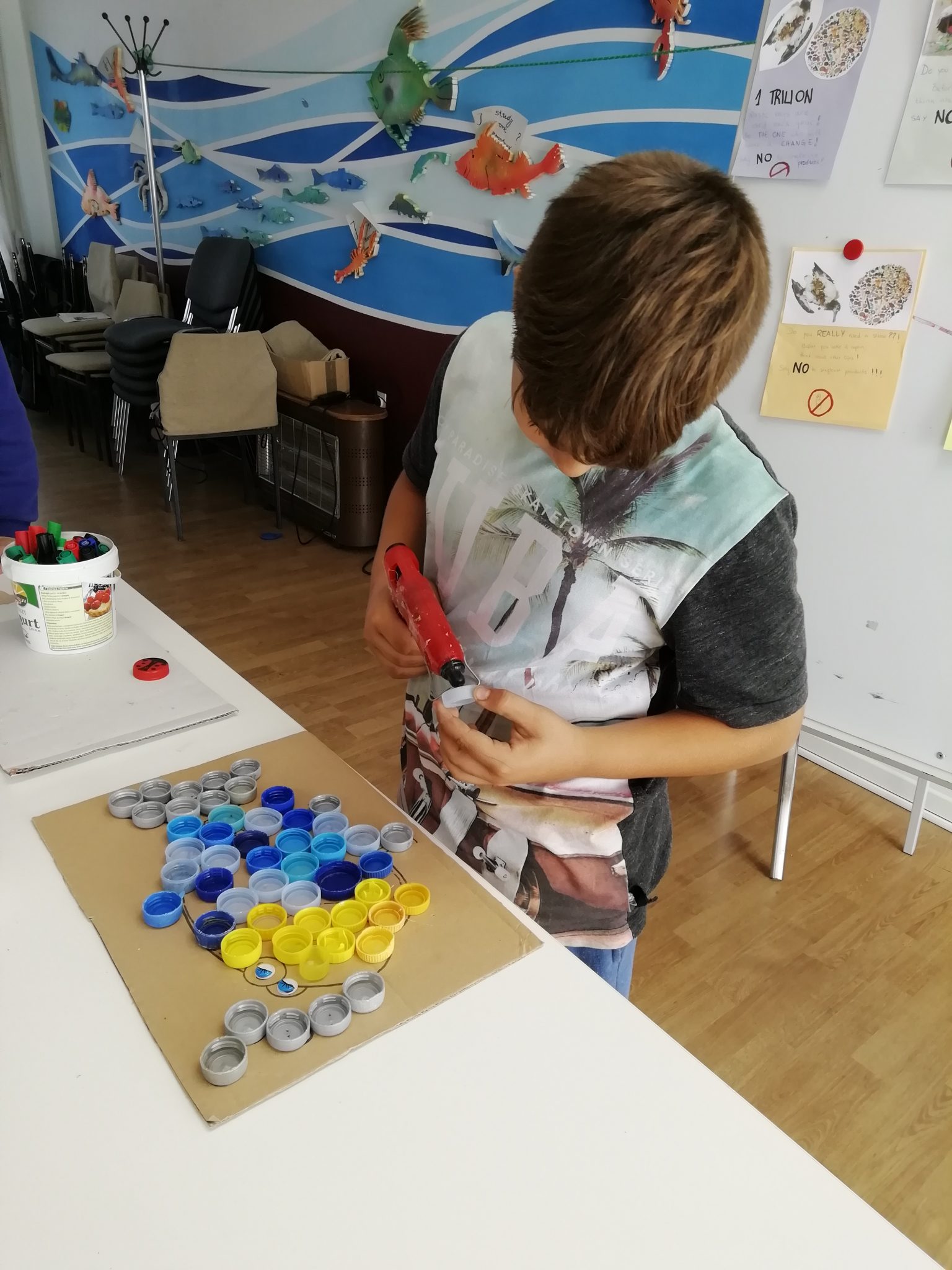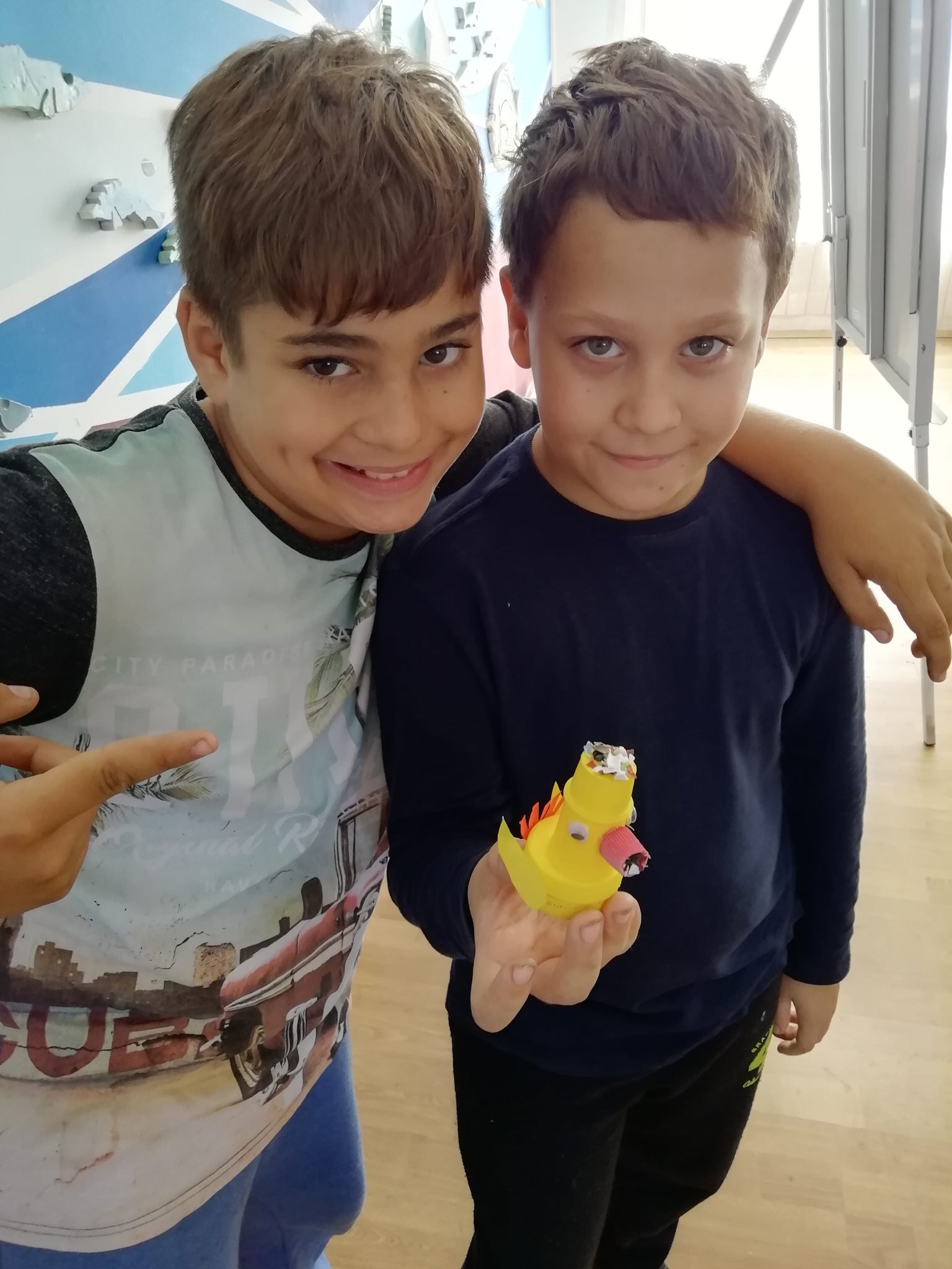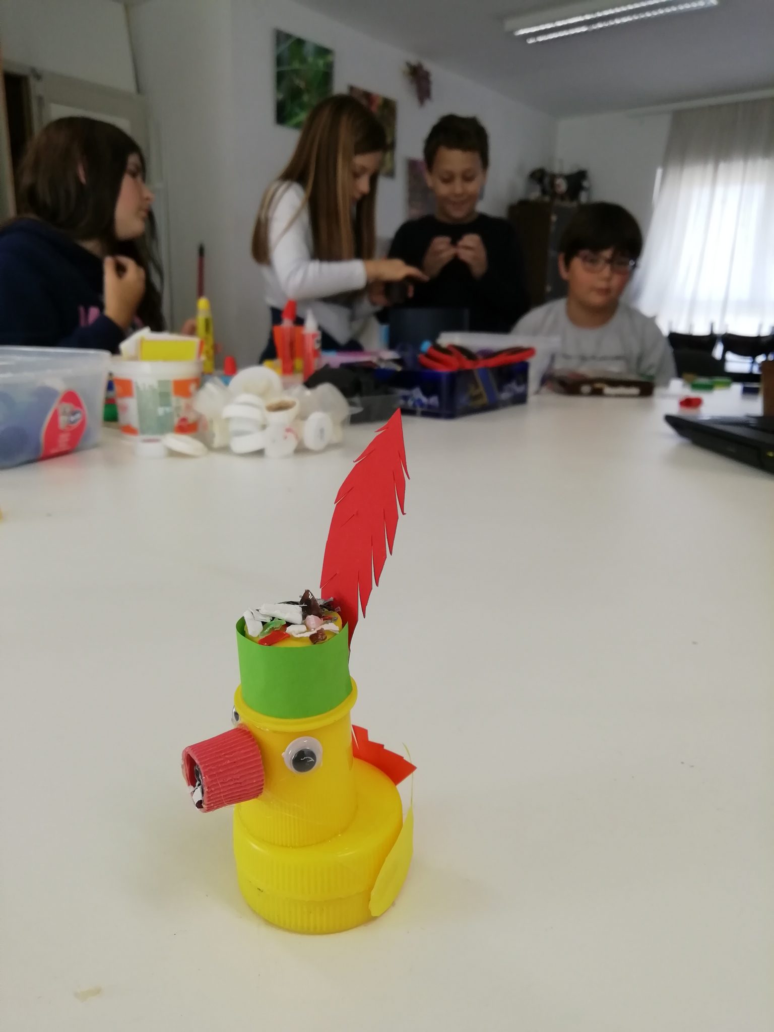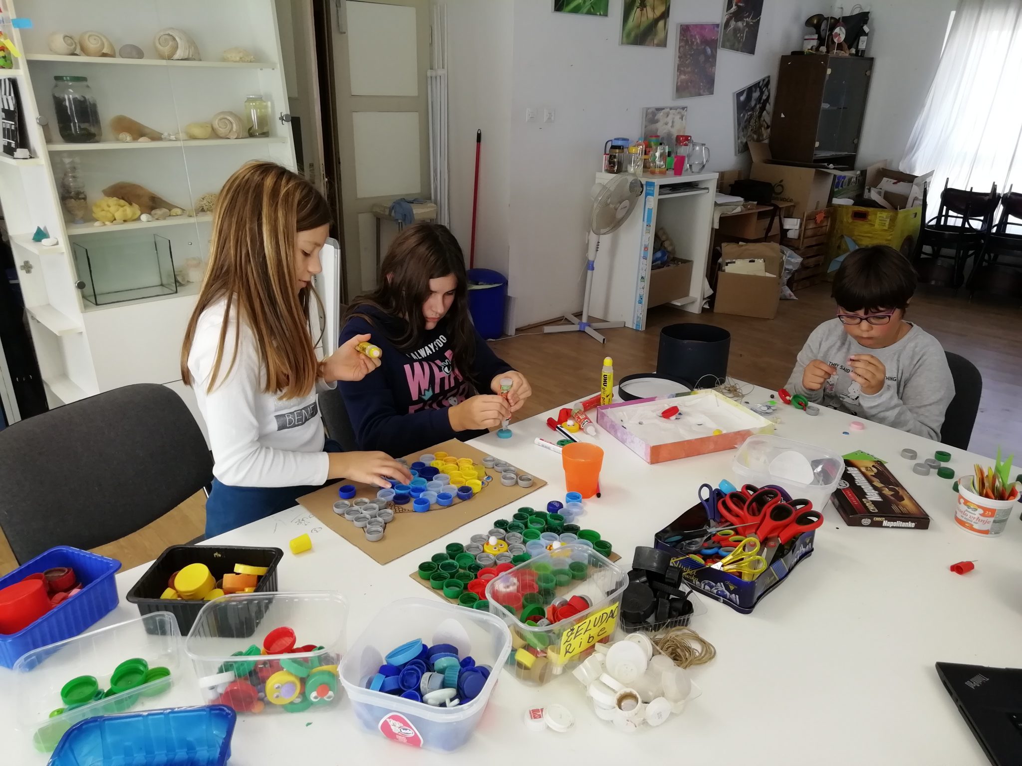 Nakon što smo se dobro izmorili, krenuli smo izrađivati umjetnička djela i igračke od plastičnih boca. Mogli ste primijetiti da smo u svim našim igrama do sada koristili plastične čepove i ostalu plastičnu ambalažu. Prenamjena i ponovna upotreba plastične ambalaže nam je uvijek u cilju.