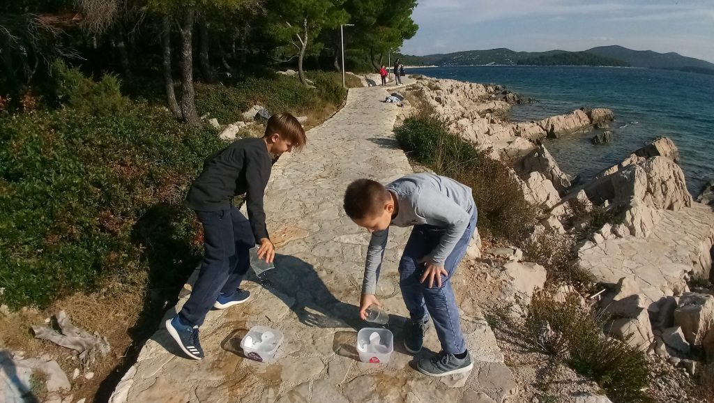 Puni dojmova, a poneki s izraženom željom da će i oni jednog dana postati hrabri vatrogasci, krenulo se put Jezera u šetnju. Tamo smo vježbali motoriku kao pravi vatrogasci, s čunjevima od plastičnih boca napunjenih vodom i kamenčićima koje smo trebali srušiti. Učili smo drveće i grmlje primorskih šuma, a alepski bor, tetiviku i malu smrdljiku smo vidjeli na licu mjesta.