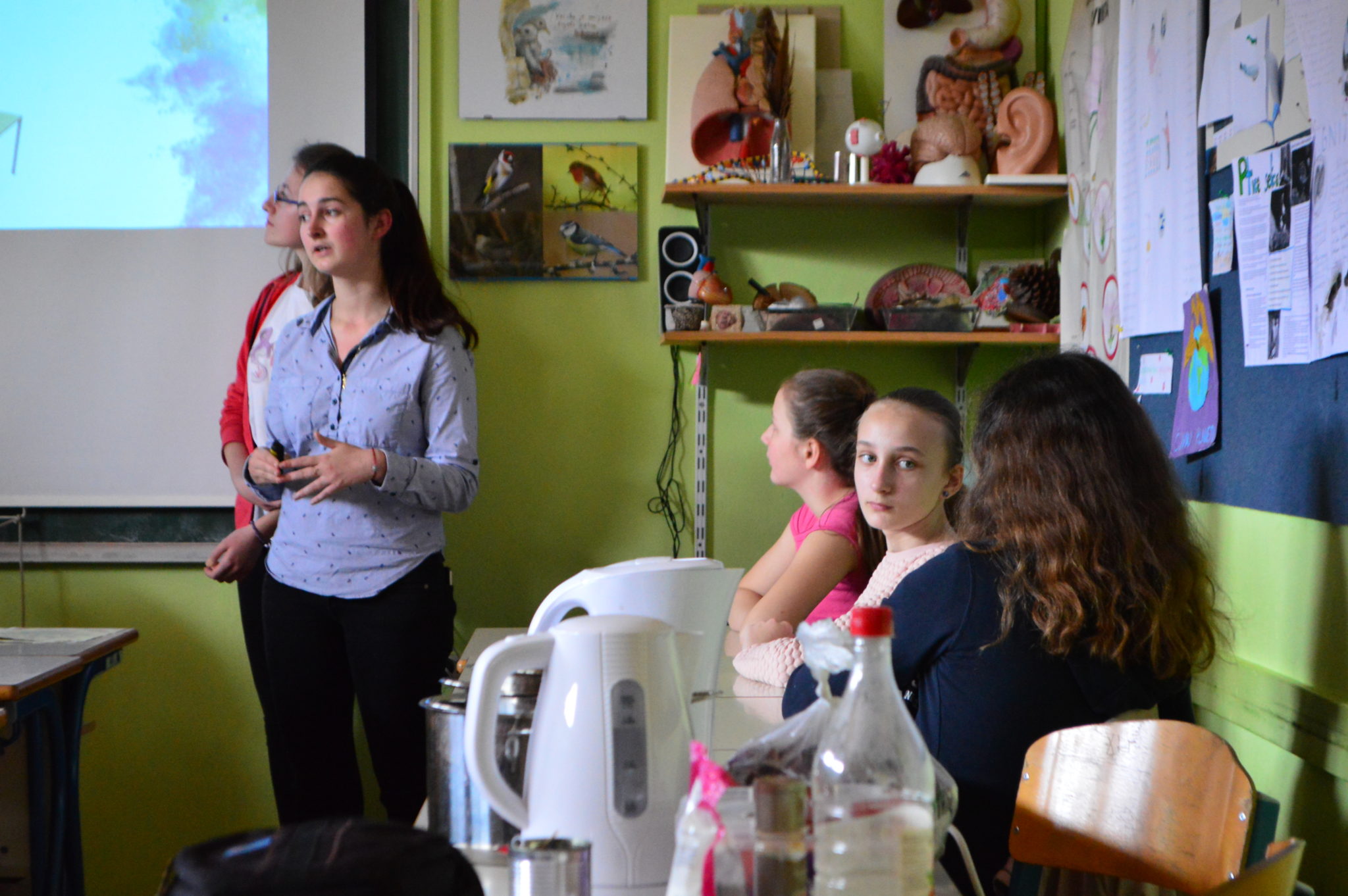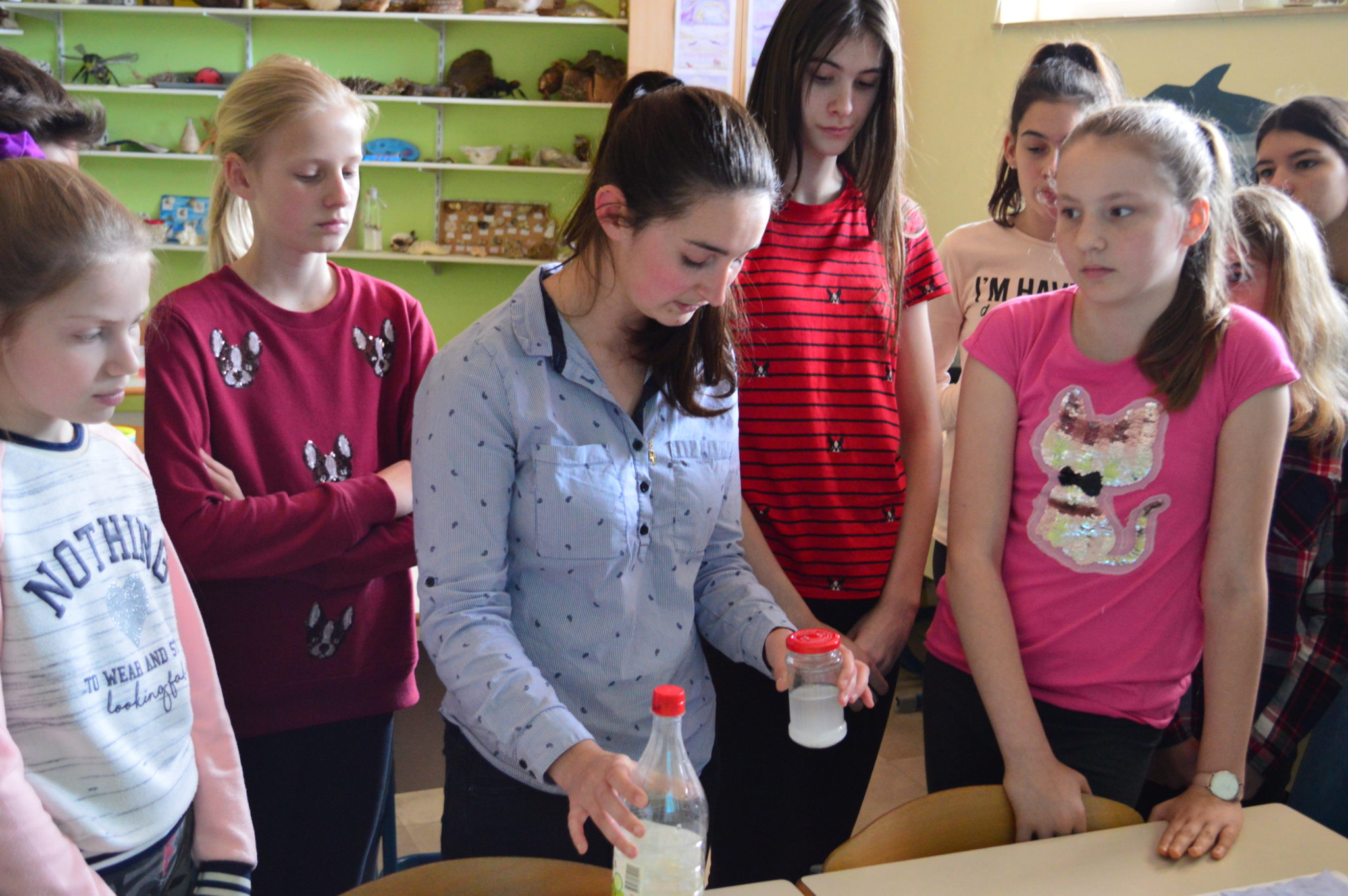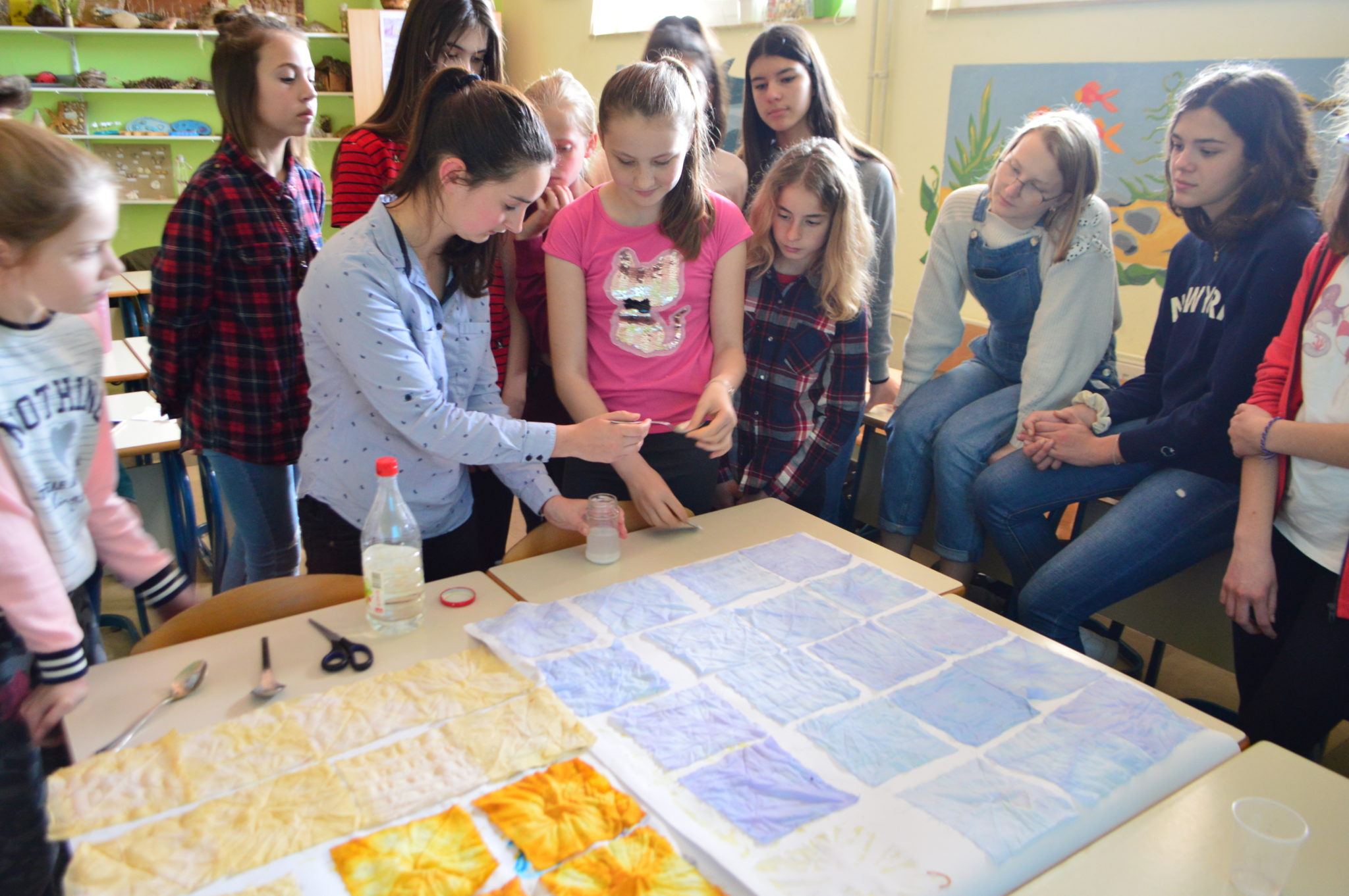 Kako priroda može biti izvor inspiracije, volonterke su spojile ono što ih okružuje – biljke, s temom festivala – boje, te prezentirale kemiju u jednom zanimljivom izdanju. U radionici „Biljke i boje“ učenici su saznali na koji način smo došli od 3 temeljne boje do njih preko 30 000, kome dugujemo plavu boju traperica i zašto bi se radi toga dobila Nobelova nagrada, zbog čega tekstilna industrija toliko zagađuje okoliš te koja su rješenja. Nakon interaktivnog teorijskog dijela, učenici su se podijeli u grupe i iskušali afričku tehniku bojanja s biljkama i začinima koji se mogu naći u svačijem domu. Neke grupe su bile uspješnije u bojanju od drugih, ali „magične tekućine“ su prikazale sve čari kemije… Za ph-vrijednost, neki od učenika su prvi put čuli, ali ih je zaintrigiralo kada su vidjeli da se igrom s octom ili sodom bikarbonom može dobiti umjetničko djelo raznih boja i šara.