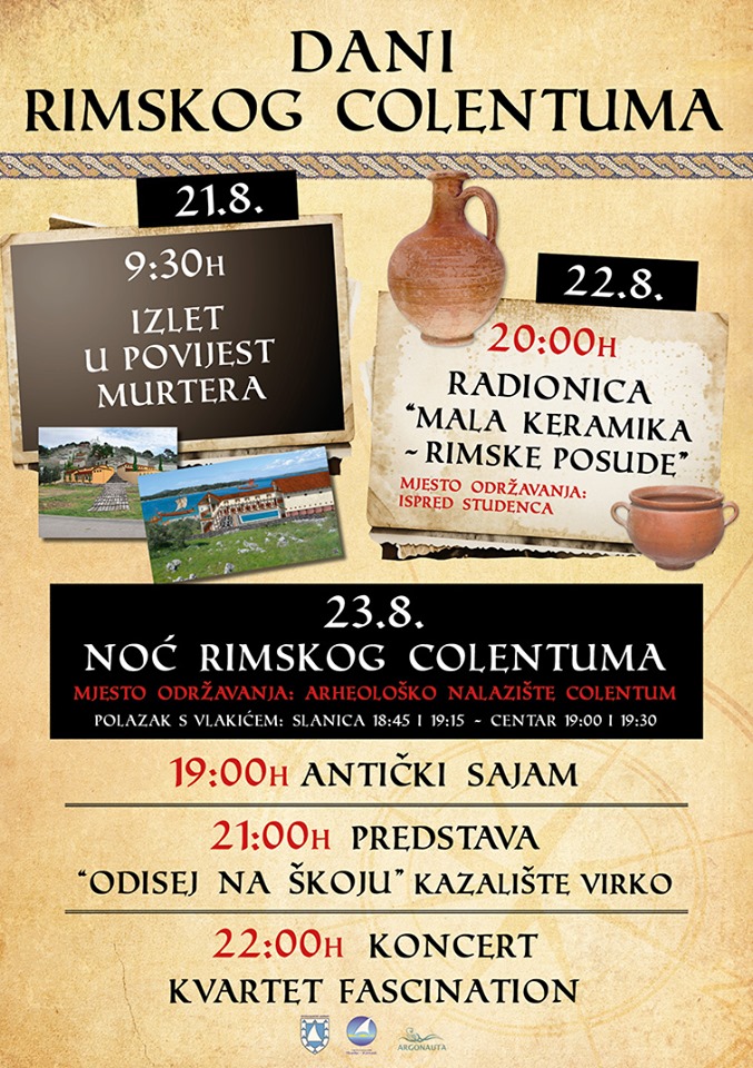 Događanja u srijedu i četvrtak uvod su u glavnu manifestaciju, “Noć Colentuma”. Manifestacija se održava na području arheološkog lokaliteta Colentum (Gradina, Murter) od 19h. Uz sajam udruge Argonauta koji će sadržavati ponešto za svakog (lovorovi vijenci, izrada rimskih kaciga, izrada mozaika, nagradne igre…), na Colentumu Vas očekuju i predstava kazališta Virko od 21h “Odisej na škoju” te koncert kvarteta od 22h. Uz to, svi okupljeni imat će priliku počastiti se na zakuski koja će biti održana na lokalitetu.