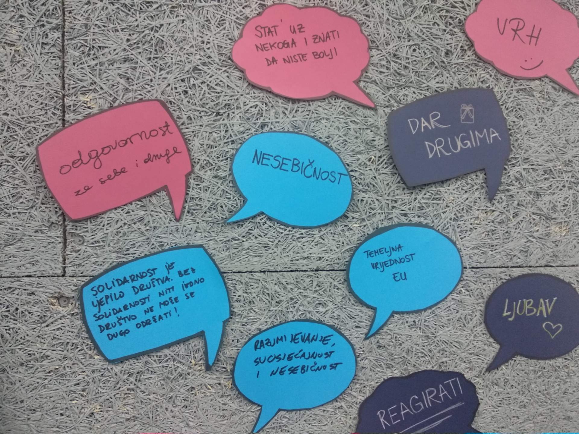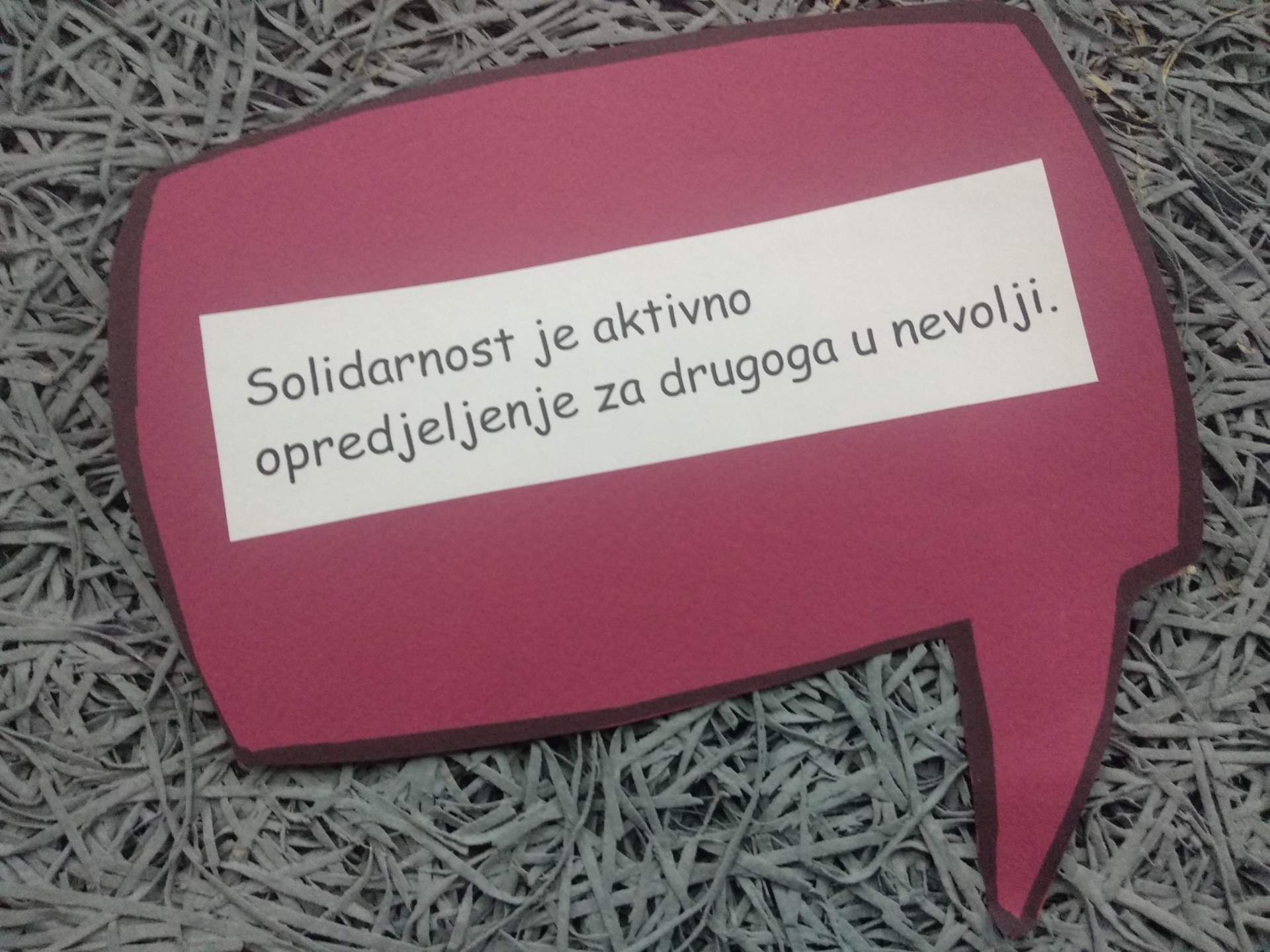 “Što je to solidarnost?” bilo je jedno od pitanje s kojim smo se pozabavili u manjim, a potom i u većim grupama. Iako svatko ima svoju verziju definicije solidarnosti, jedna je ostavila poseban dojam “Solidarnost je aktivno opredjeljenje za drugoga u nevolji”, a upravo EU potiče mlade da napišu svoje projekte i aktivno se opredijele za solidarnost prema raznim skupinama, temama, Planetu itd.