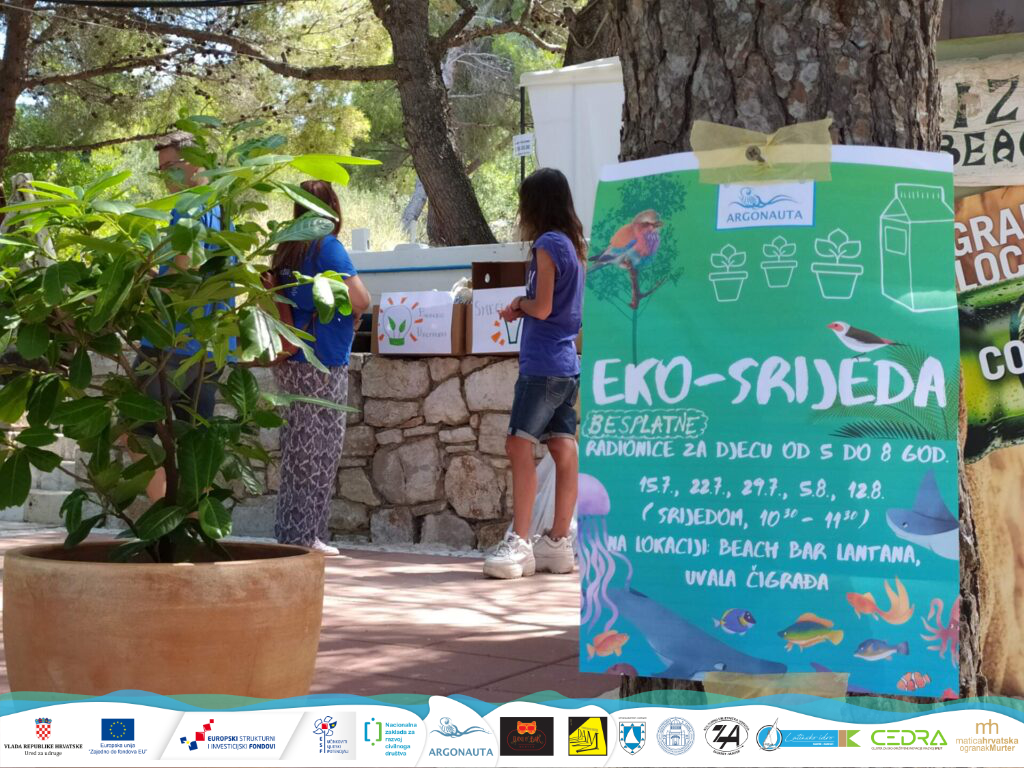 I ovog ljeta krenuli smo s ljetnim edukacijskim programom za djecu, kroz mjesec srpanj i kolovoz. Organizirat ćemo za vas 5 besplatnih radionica pod zajedničkim nazivom „Eko srijeda“ za djecu uzrasta od 5 do 8 godina. Radionice će se održavati svake srijede u terminu od 10:30 do 11:30h, počevši s 15.7.2020., a završno s 12.8.2020., na lokaciji Beach bar Lantana u uvali Čigrađa.