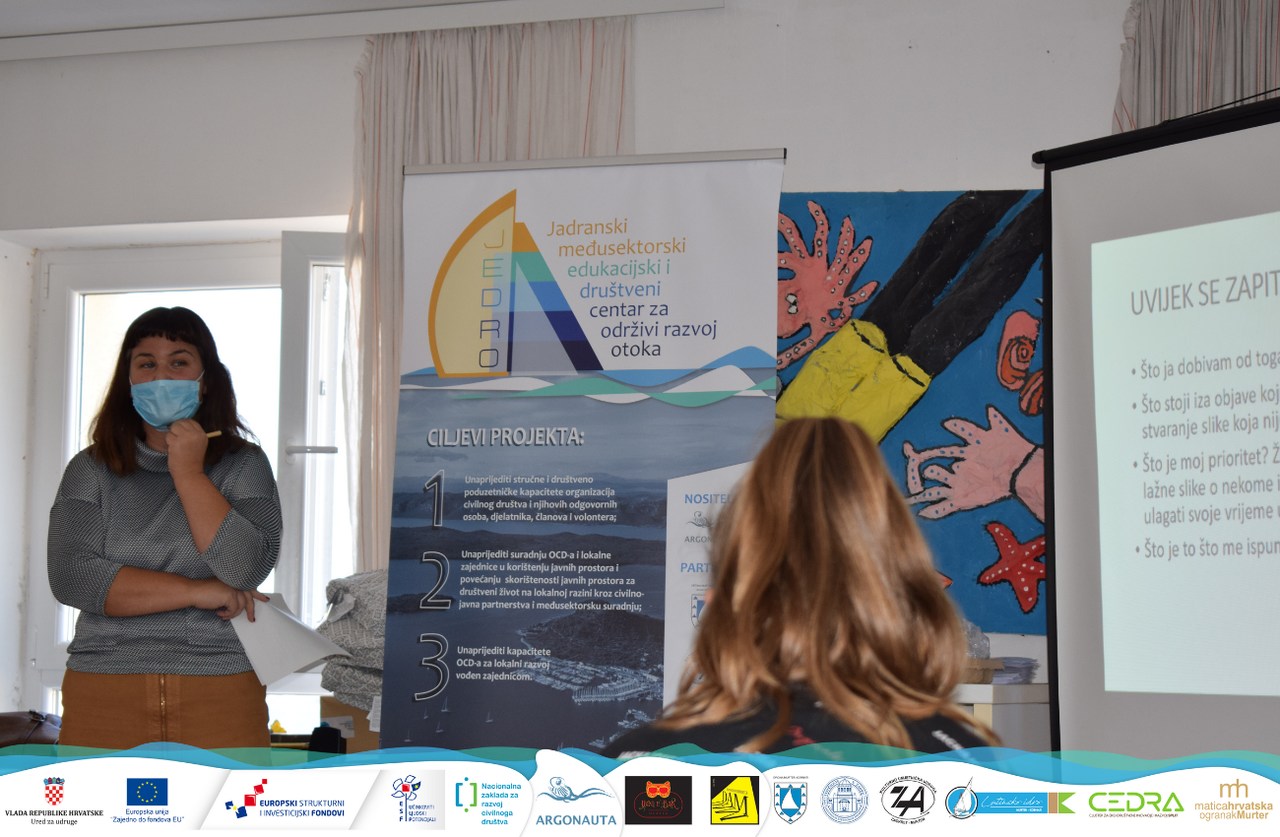 U četvrtak, 29. listopada 2020. u prostoru i sklopu kalendara budućeg Društvenog centra Jedro u Murteru, s učenicima osmog razreda OŠ Murterski škoji održana je medijska radionica na kojoj se razgovaralo i diskutiralo o slici svijeta koju nam prezentiraju društvene mreže, konkretno Instagram.
