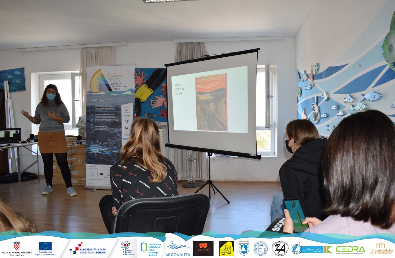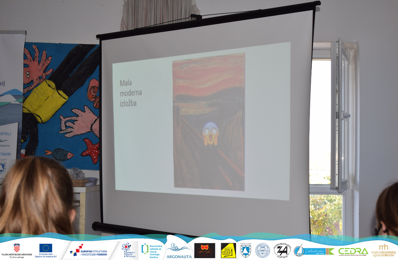 Za kraj radionice je voditeljica učenicima pokazala nekoliko klasičnih djela likovne umjetnosti kojima su suvremeni kreativci nadodali pojedine digitalne elemente kao što su emojis, oznake za „like“ i slično. Bilo je vrlo zanimljivo čuti mišljenja i interpretacije tih djela od murterskih osnovnoškolaca.