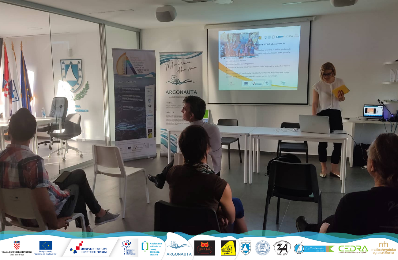 Za vrijeme trajanja projekta Jedro renoviran je i opremljen prostor koji je velikodušno ustupila Općina Murter – Kornati kako bi lokalna zajednica dobila društveni centar otvoren svima; na projektu je sudjelovalo 7 partnerskih organizacija – civilni i javni sektor, udruge, lokalna samouprava i sveučilište, odnosno udruge Argonauta, Latinsko idro, Ogranak Matice hrvatske u Murteru, KUU Zaokret, CEDRA Split, Općina Murter – Kornati te Sveučilište u Zadru. Uz njih na projektu su sudjelovale i dvije suradničke organizacije; Dramski amateri Murter i Karnevalska udruga Murterske poklade.