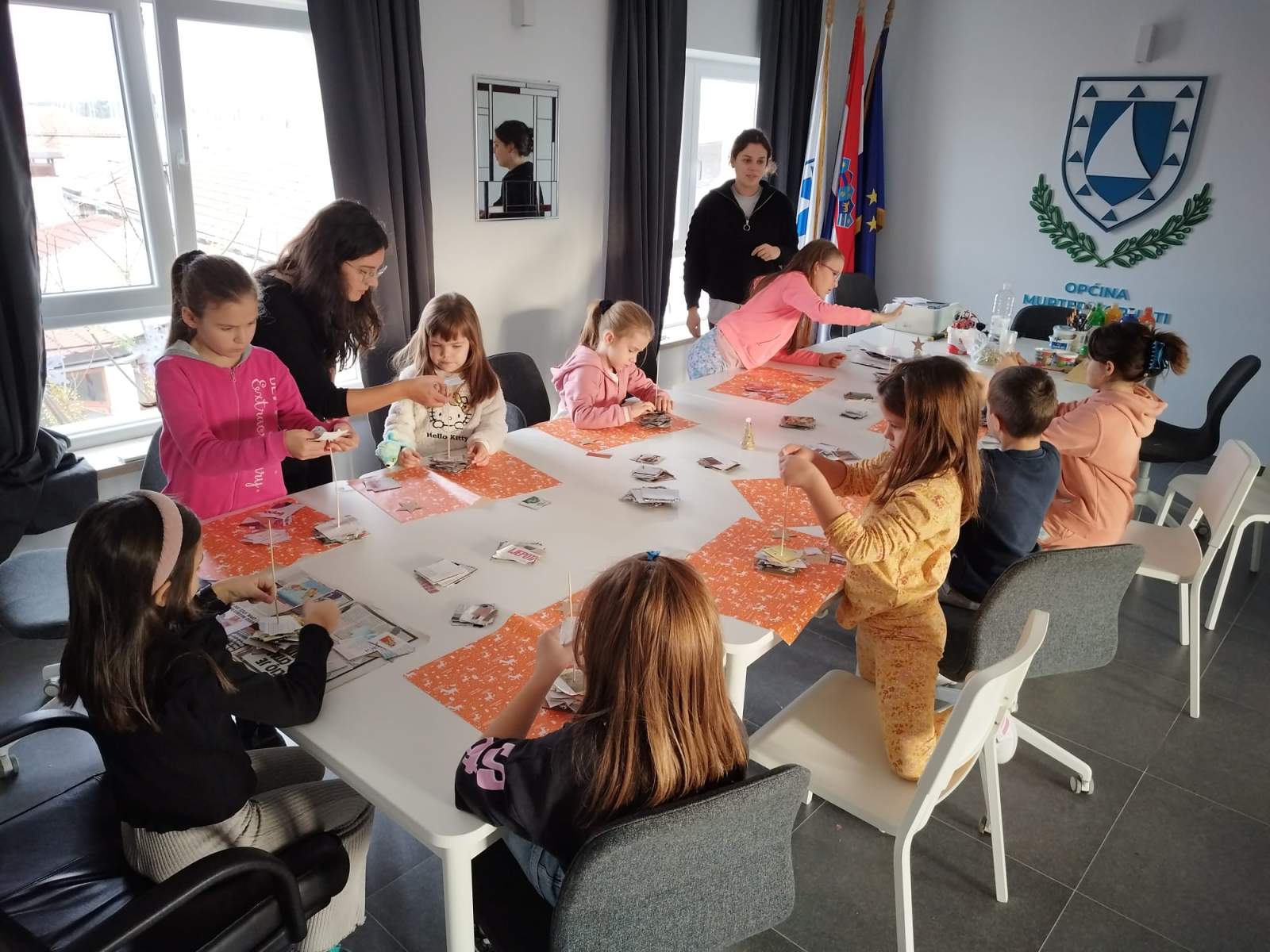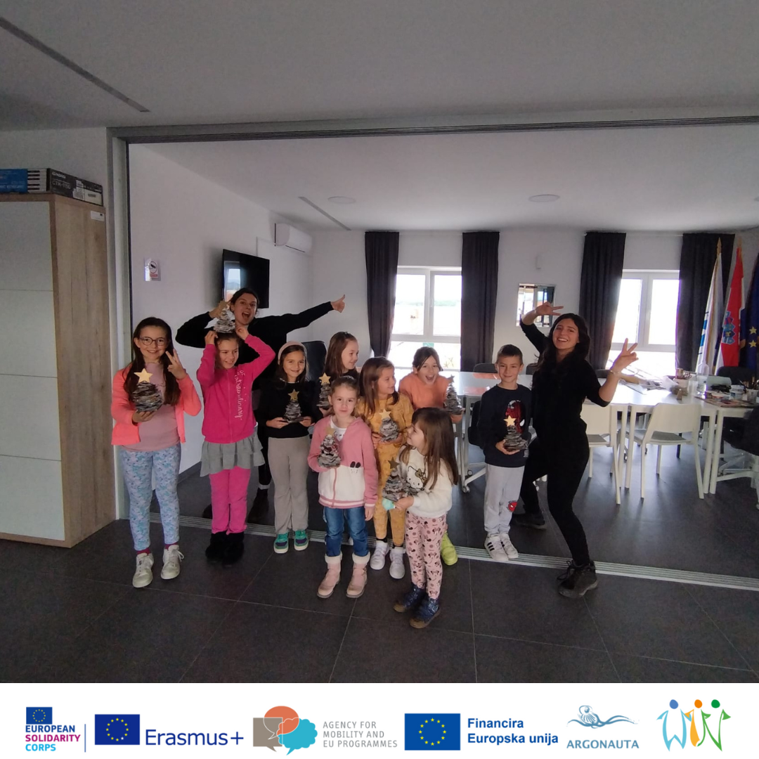 Volonterke Romina i Juliette pokazale su još jednom svoju kreativnost kroz radionicu izrade božićnih drvca od starih novina i časopisa. Kreativno, zar ne? Djeca su igrala križić kružić u kojem su šiške oblikovane u vijenac predstavljale kružić, a zvijezda napravljena od kartona i ukrašena šiškama glumila je križić. Djeca su s ponosom donijeli u svoje domove prekrasne kreacije, a nadamo se da su roditelji bili oduševljeni kako i mi.