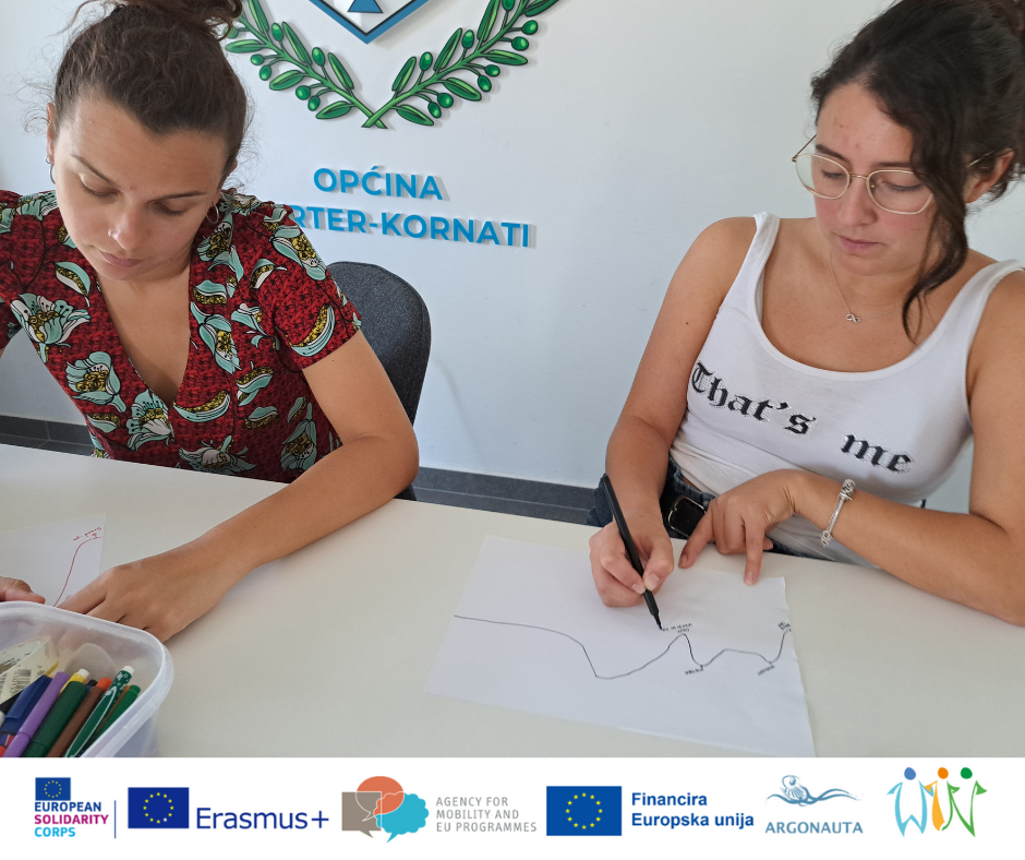 Refleksiju smo iskoristili za sagledanje emocija i mentalnog zdravlja u toku mjeseca. Naše ESC volonterke Juliette i Romina na listu papira morale su nacrtati vrtuljak u kojem svaka linija predstavlja dobre i loše trenutke koji su se dogodili u prethodnom razdoblju. Ovo im je omogućilo da pogledaju širu sliku svojih emocija kroz mjesec, te što su im okidači i stresori u vremenima kad se mentalno ne osjećaju dobro.