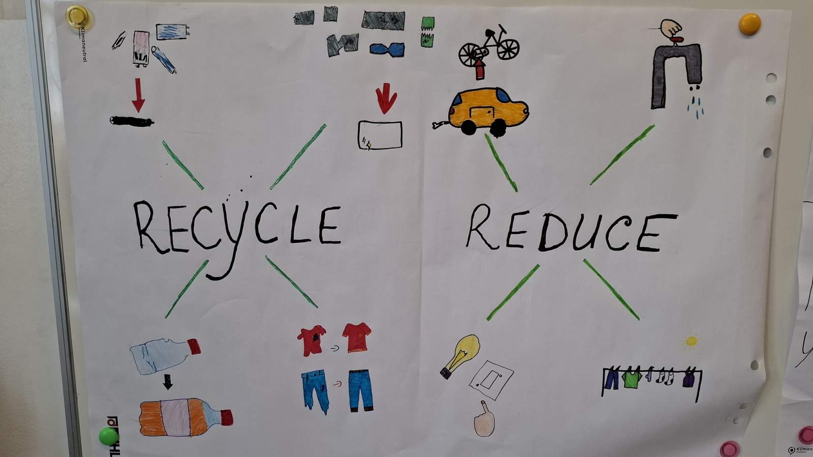 Radionica je započela analizom domaće zadaće u kojoj su učenici pratili količinu i vrstu otpada koji proizvode, a rezultati su pokazali porast svijesti o vlastitom utjecaju na okoliš. Slijedio je energizer u kojem su učenici, kroz igru s pojmovima priroda, okoliš, biljke i životinje, ušli u temu ekosustava te zajednički promišljali o njegovoj važnosti i osjetljivoj ravnoteži. Potom su se prisjetili koncepta 7R (Recycle, Refurbish, Reduce, Reuse, Repair, Rethink, Recover) te u timovima izrađivali vizualne prikaze svakog od tih principa – koristeći crteže, stripove i priče za njihovu svakodnevnu primjenu.
