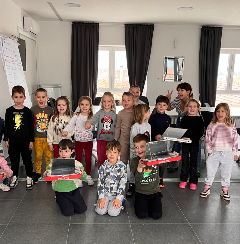 Nakon uvoda, prionuli smo na praktični dio – izrađivali smo solarne pećnice koristeći reciklirane kutije za pizzu! Djeca su sa zanimanjem pratila proces i s oduševljenjem isprobavala kako sunčeva energija može poslužiti za zagrijavanje hrane…i topljenje čokolade😊