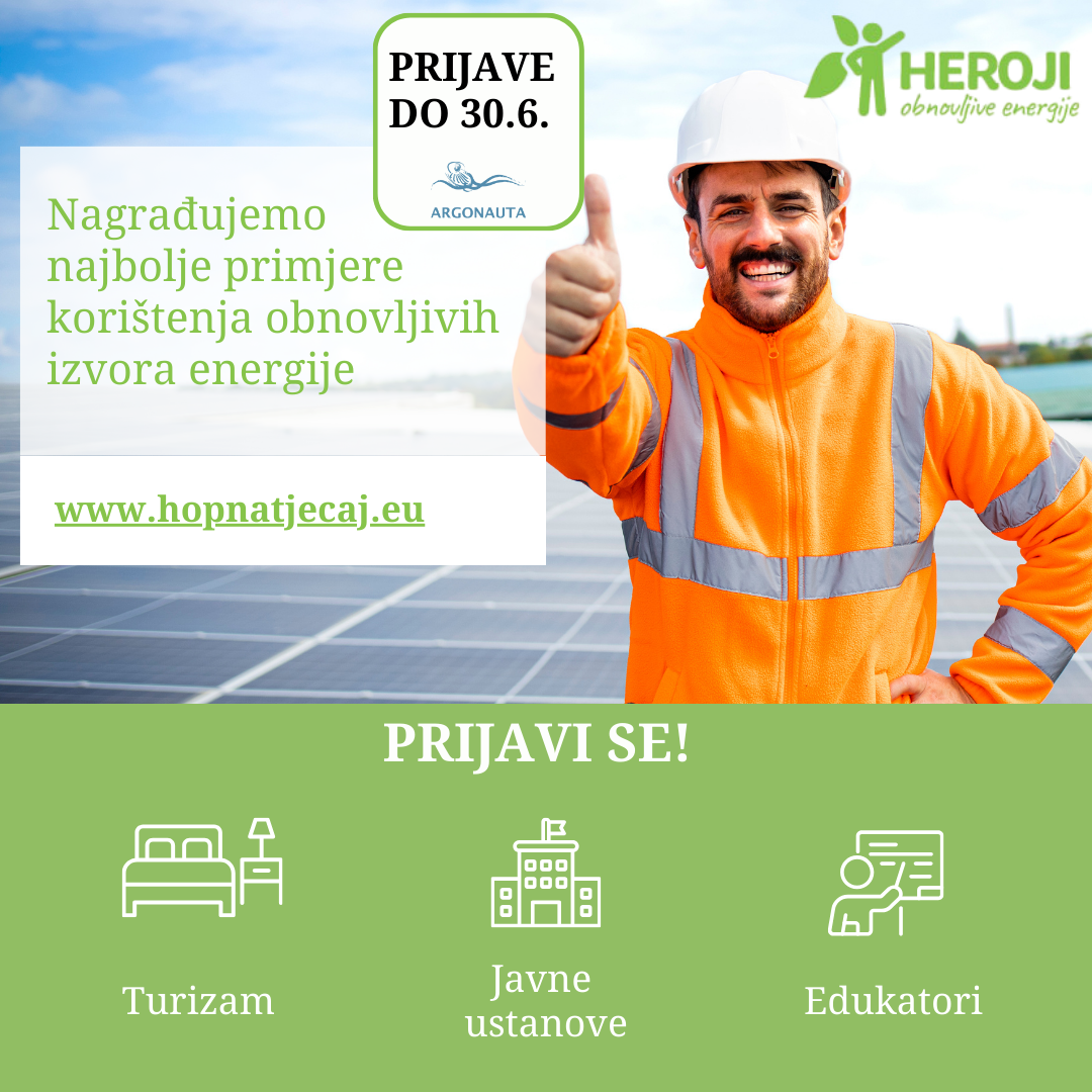 Udruga Argonauta poziva pojedince, organizacije i javne ustanove da se prijave na nagradni natječaj koji prepoznaje i nagrađuje konkretne primjere korištenja obnovljivih izvora energije i promicanja energetske održivosti. Cilj je istaknuti pozitivne primjere koji mogu inspirirati druge i poslužiti kao putokaz ka zelenijoj budućnosti.