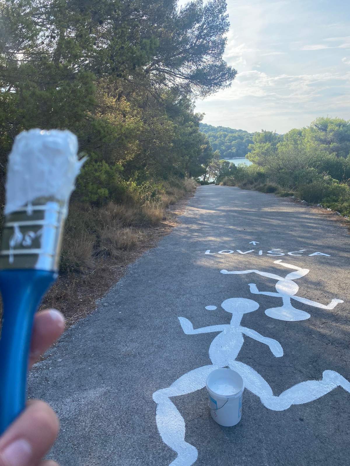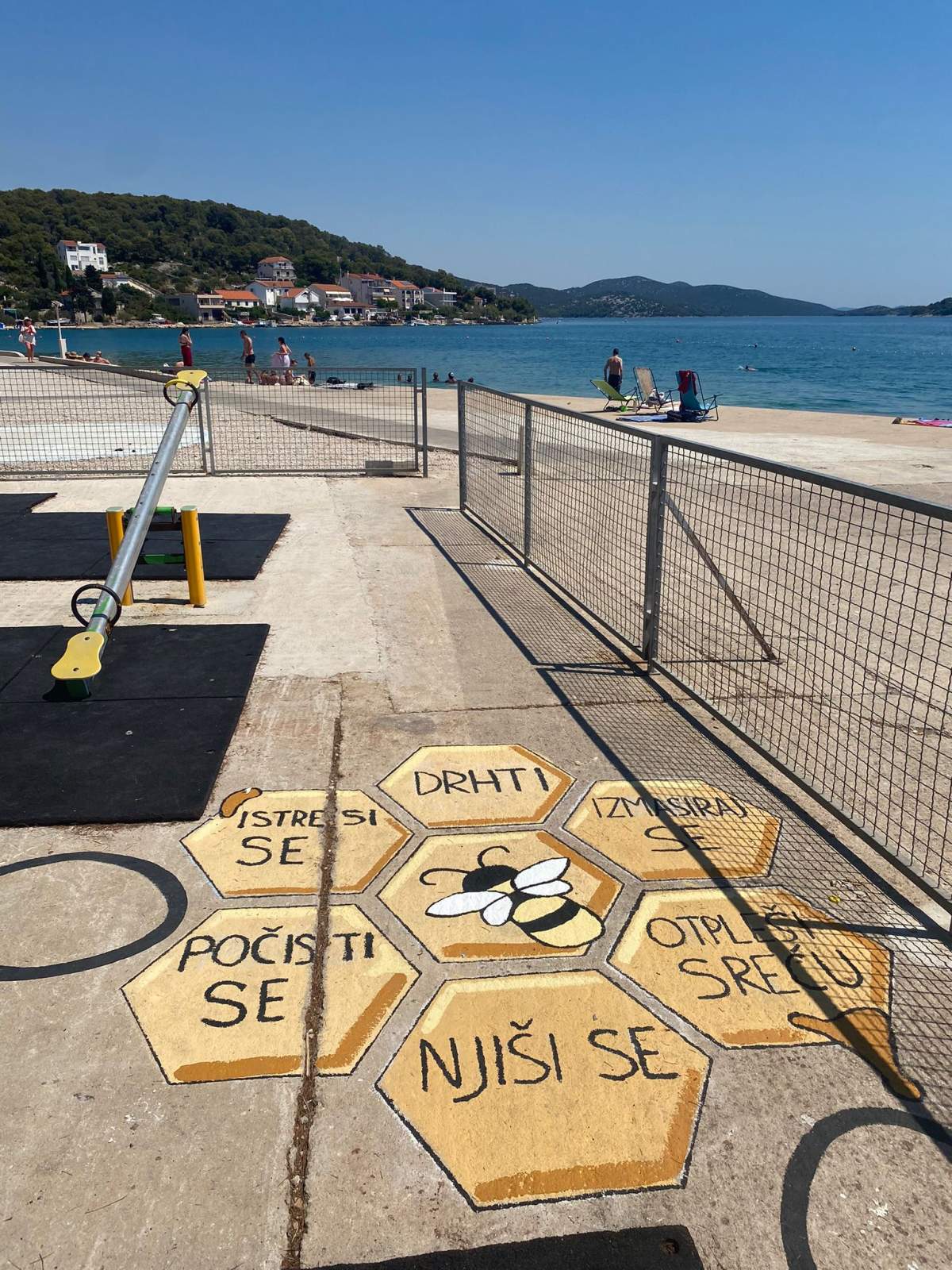 One of them was painting a game on the floor for children in Tisno. This game was about bees, to explain to children the importance of bees. I was painting a game to jump in different bee poligon and later, I designed a flyer to explain the rules of the game.